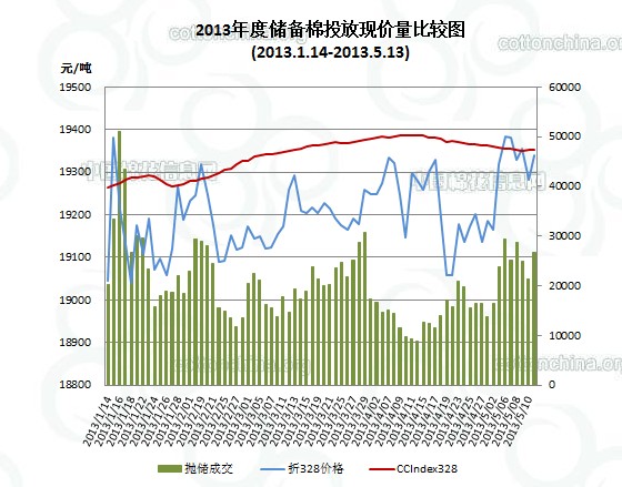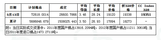 5月13日儲備棉投放數(shù)量為72618.0014噸,實際成交26600.7866噸,成交比例36.63%;其中2011年度棉花成交13916.2094噸,2012年度棉花成交11211.3061噸;當(dāng)日2011年度1473.2711噸進口棉全部成交。當(dāng)日成交儲備棉平均等級為3.46,較上一交易日高0.11;平均長度28.24,較前一交易日長0.06;加權(quán)成交價19120元/噸,較上一交易日上調(diào)132元/噸;折328級成交價19338元/噸(公重),較前一交易上升57元/噸,比當(dāng)日CCIndex328價格低13元/噸。截止5月13日,累計上市總量5686846.679噸,累計成交總量1508025.443噸,成交比例26.51%。