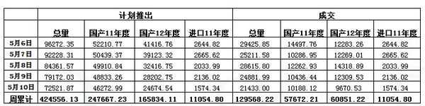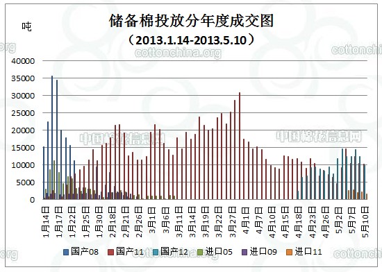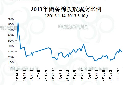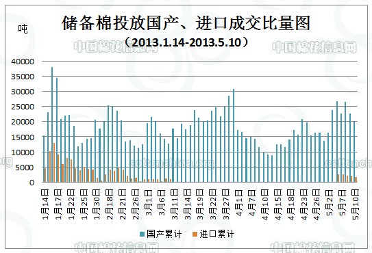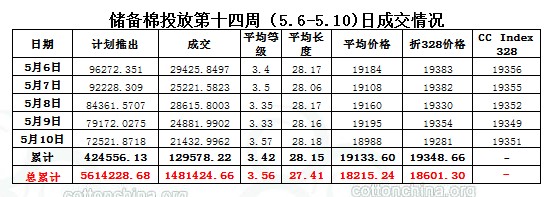 上周(5.6-5.10)累計投放儲備棉424556.13噸,實際成交129568.219噸,成交比例30.52%;當周成交儲備棉平均等級為3.42,平均長度28.15,加權成交價19134元/噸,折328級成交價19349元/噸(公重)。截止上周,2013年以來累計上市投放儲備棉5614228.68噸,累計成交總量1481424.66噸,成交比例26.39%。