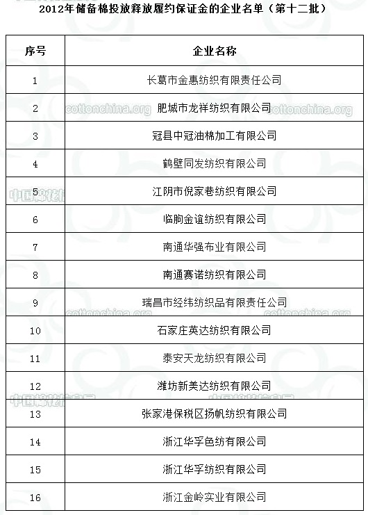 2012年儲備棉投放釋放履約保證金的企業(yè)名單(第十二批)