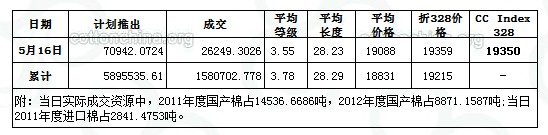 5月16日儲備棉投放數(shù)量為70942.0724噸,實際成交26249.3026噸,成交比例37%;其中2011年度棉花成交14536.6686噸,2012年度棉花成交8871.1587噸;當(dāng)日2011年度2841.4753噸進口棉全部成交。當(dāng)日成交儲備棉平均等級為3.55,較上一交易日高0.10;平均長度28.23,較前一交易日長0.02;加權(quán)成交價19088元/噸,較上一交易日高51元/噸;折328級成交價19359元/噸(公重),較前一交易下降7元/噸,比當(dāng)日CCIndex328價格高9元/噸。截止5月16日,累計上市總量5895535.61噸,累計成交總量1580702.778噸,成交比例26.81%。