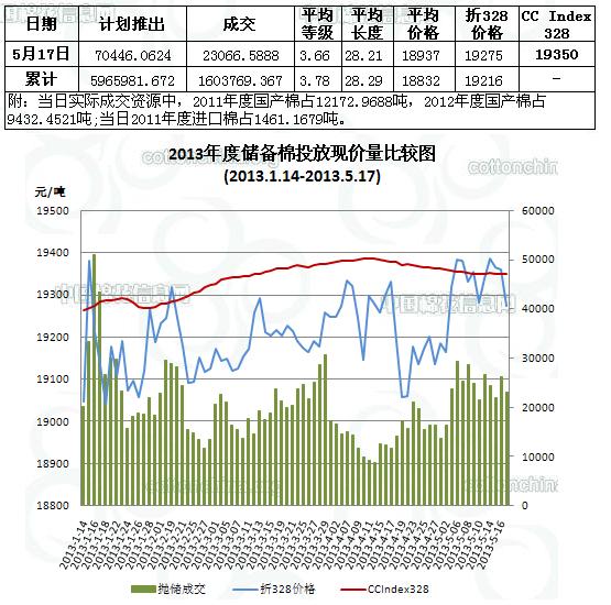 5月17日儲備棉投放數(shù)量為70446噸,實際成交23067噸,成交比例32.74%,較昨日降低4.26%;其中2011年度棉花成交13634噸,2012年度棉花成交9432噸;當日2011年度1461噸進口棉全部成交。當日成交儲備棉平均等級為3.66,較上一交易日降低0.11;平均長度28.21,較前一交易日降0.02;加權成交價18937元/噸,較上一交易日低151元/噸;折328級成交價19275元/噸(公重),較前一交易下降84元/噸,比當日CCIndex328價格低75元/噸。截止5月17日,累計上市總量5965981.672噸,累計成交總量1603769.367噸,成交比例26.88%。