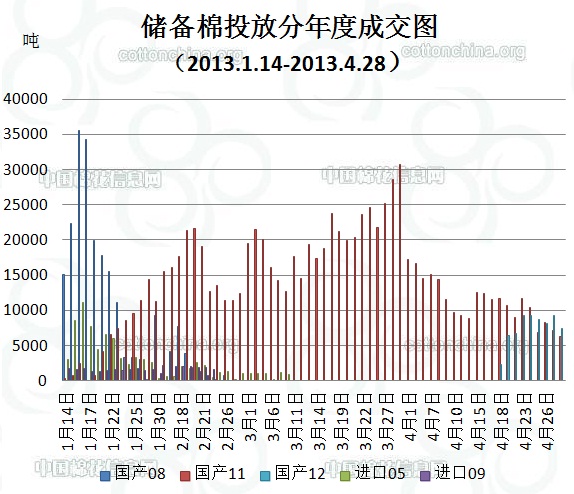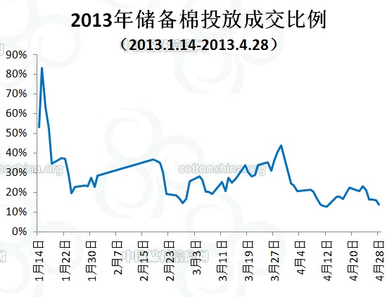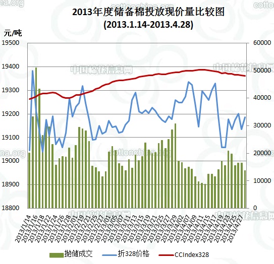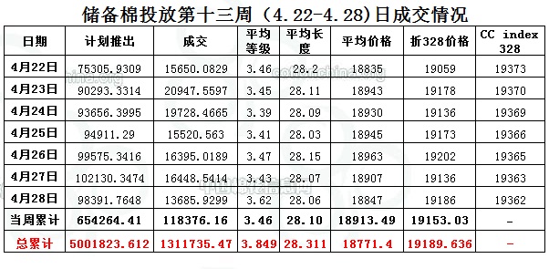 上周(4.22-4.28)七個(gè)工作日累計(jì)投放儲(chǔ)備棉654264.406噸,較前一周增加296996.218噸,實(shí)際成交118376.1623噸,較前一周增加50614.4592噸,七日累計(jì)成交比例18.97%,較前一周周降低0.88%;當(dāng)周成交儲(chǔ)備棉平均等級(jí)為3.46,平均長度28.10,加權(quán)成交價(jià)18913元/噸,折328級(jí)成交價(jià)19153元/噸(公重),較前一周降60元/噸,比當(dāng)周CCIndex328價(jià)格低240元/噸。截止上周,2013年以來累計(jì)上市投放儲(chǔ)備棉5001823.612噸,累計(jì)成交總量1311735.473噸,成交比例26.23%。