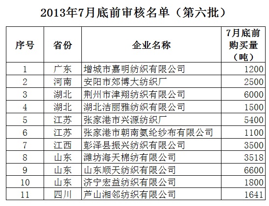 2013年儲備棉投放7月底前審核競買紡織企業(yè)名單(第六批)