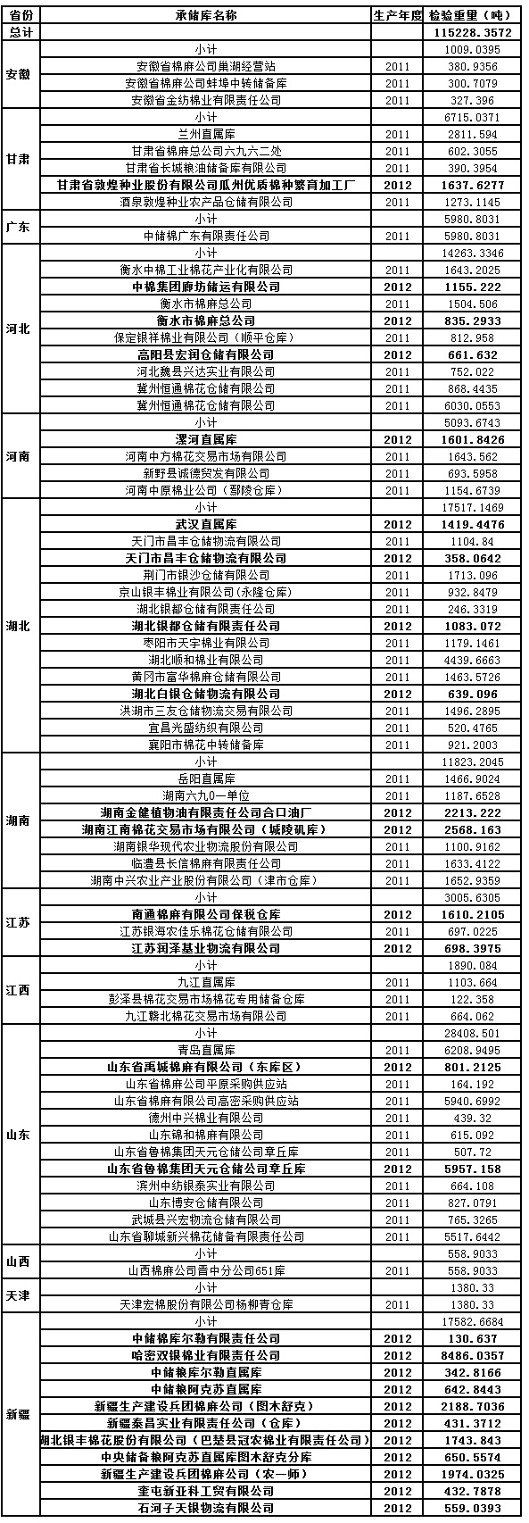 中國儲備棉管理總公司定于5月23日出庫銷售儲備115228.3572噸,其中進口棉30117.6651噸。相關(guān)批次公檢數(shù)據(jù)見附件。具體庫點如下:
