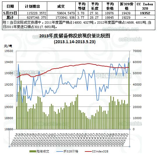 5月23日儲(chǔ)備棉投放數(shù)量為115228.3572噸,實(shí)際成交59604.5479噸,成交比例51.73%,較昨日提高19.87%;其中2011年度國(guó)產(chǎn)棉花成交14800.4027噸,2011年度進(jìn)口棉成交30117.6651噸,2012年度國(guó)產(chǎn)棉花成交14686.4801噸。當(dāng)日成交儲(chǔ)備棉平均等級(jí)為3.78,較上一交易日降低0.39;平均長(zhǎng)度27.91,較前一交易日降低0.11;加權(quán)成交價(jià)18976元/噸,較上一交易日降112元/噸;折328級(jí)成交價(jià)19439元/噸(公重),較前一交易日漲130元/噸,比當(dāng)日CCIndex328價(jià)格高87元/噸。截止5月23日,累計(jì)上市總量6297348.375噸,累計(jì)成交總量1733841.936噸,成交比例27.53%。