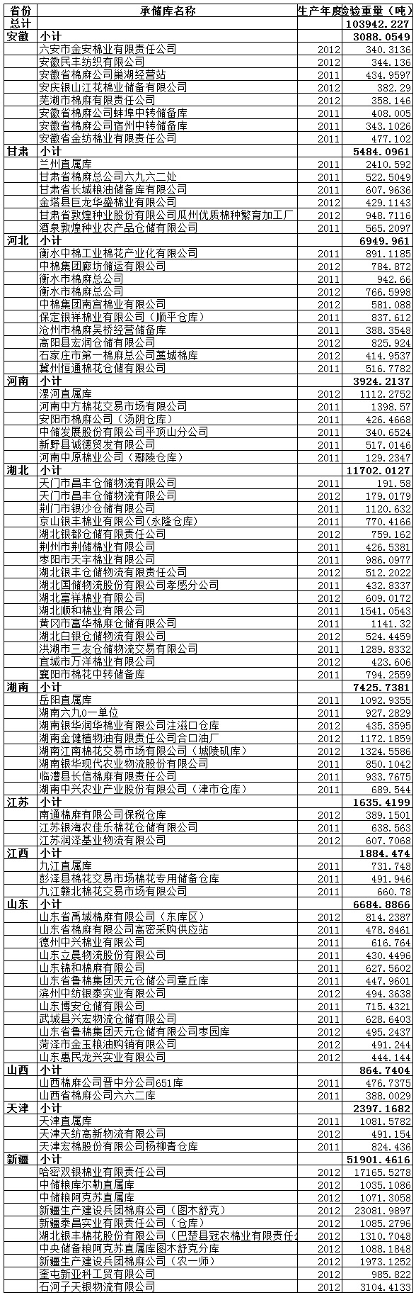 中國儲備棉管理總公司定于5月28日出庫銷售儲備103942.2272噸,其中進口棉1081.5782噸。相關(guān)批次公檢數(shù)據(jù)見附件。具體庫點如下: