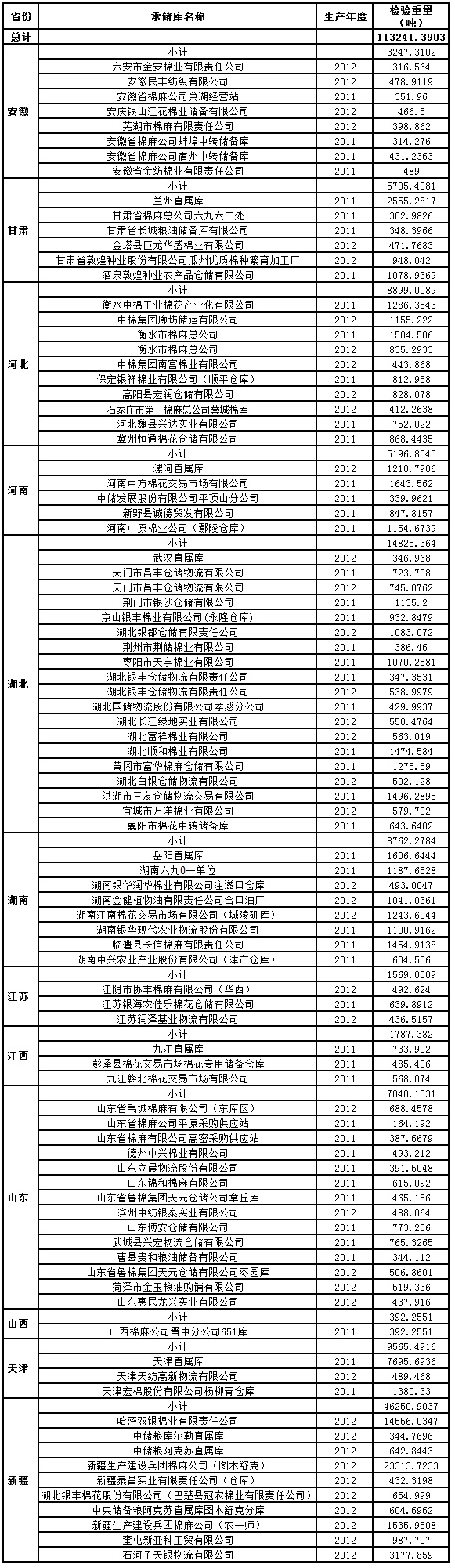 中國(guó)儲(chǔ)備棉管理總公司定于5月30日出庫(kù)銷(xiāo)售儲(chǔ)備113241.3903噸,其中進(jìn)口棉7695.6936噸。相關(guān)批次公檢數(shù)據(jù)見(jiàn)附件。具體庫(kù)點(diǎn)如下: