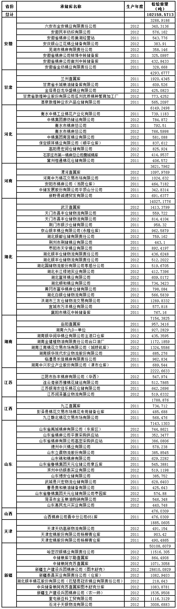中國(guó)儲(chǔ)備棉管理總公司定于5月31日出庫(kù)銷(xiāo)售儲(chǔ)備102159.5713噸,其中進(jìn)口棉490.4865噸。相關(guān)批次公檢數(shù)據(jù)見(jiàn)附件。具體庫(kù)點(diǎn)如下: