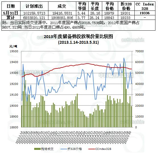 5月31日儲(chǔ)備棉投放數(shù)量為102159.5713噸,實(shí)際成交19416.5531噸,成交比例19.01%,為5月3日以來最低,較昨日降6.16%,其中2011年度國(guó)產(chǎn)棉花成交9318.7536噸,2011年度進(jìn)口棉成交490.4865噸,2012年度國(guó)產(chǎn)棉花成交9607.313噸。當(dāng)日成交儲(chǔ)備棉平均等級(jí)為3.44,較上一交易日提高0.35;平均長(zhǎng)度28.16,較前一交易日提高0.27;加權(quán)成交價(jià)18979元/噸,較上一交易日提高135元/噸;折328級(jí)成交價(jià)19201元/噸(公重),較前一交易日降109元/噸,比當(dāng)日CCIndex328價(jià)格低135元/噸。截止5月31日,累計(jì)上市總量6933920.121噸,累計(jì)成交總量1908092.806噸,總成交比例27.52%。其中進(jìn)口棉累計(jì)成交218453.9235噸,5月6號(hào)至今累計(jì)成交進(jìn)口棉105906.5118噸。