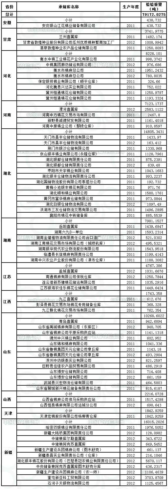 定于5月9日出庫(kù)銷售儲(chǔ)備棉79172.0275噸,其中2011年度國(guó)產(chǎn)棉48833.259噸,2012年度國(guó)產(chǎn)棉28202.7467噸,2011年度進(jìn)口棉2136.0218噸。相關(guān)批次公檢數(shù)據(jù)見附件。具體庫(kù)點(diǎn)如下: