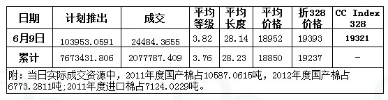 6月9日儲(chǔ)備棉投放數(shù)量為103953.0591噸,實(shí)際成交24484.7369噸,成交比例23.55%,較昨日減少2.81%,其中2011年度國產(chǎn)棉花成交10587.0615噸,2012年度國產(chǎn)棉花成交6773.2811噸,2011年度進(jìn)口棉7124.0229噸。當(dāng)日成交儲(chǔ)備棉平均等級(jí)為3.82,較上一交易日下降0.07;平均長度28.14,較上一交易日上漲0.08;加權(quán)成交價(jià)18952元/噸,較上一交易日漲79元/噸;折328級(jí)成交價(jià)19393元/噸(公重),較前一交易日上漲109元/噸,比當(dāng)日CCIndex328價(jià)格高72元/噸。截止6月9日,累計(jì)上市總量7673431.806噸,累計(jì)成交總量2077787.409噸,總成交比例27.08%。其中進(jìn)口棉累計(jì)成交252014.12噸,5月6號(hào)至今累計(jì)成交進(jìn)口棉140139.2455噸。