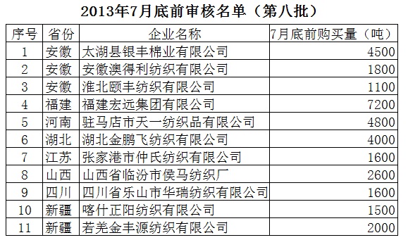 2013年儲備棉投放7月底前審核競買紡織企業(yè)名單(第八批)