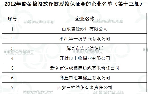 2012年儲備棉投放釋放履約保證金的企業(yè)名單(第十三批)