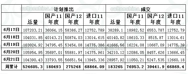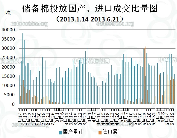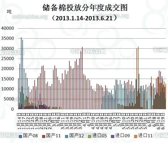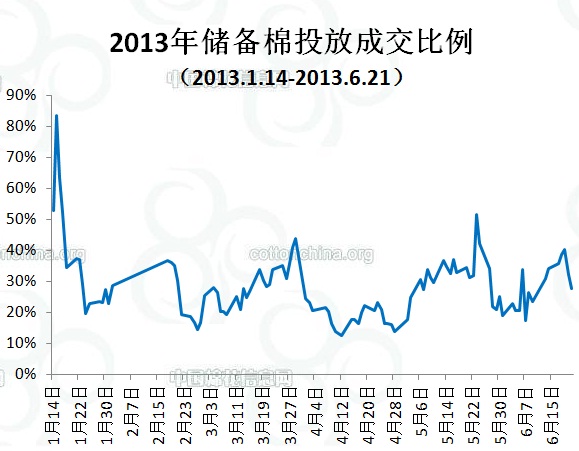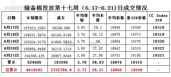 上周(6.17-6.21)累計投放儲備棉524605.3469噸,實(shí)際成交183264.5227噸,成交比例27.74%;當(dāng)周成交儲備棉平均等級為3.79,平均長度28.03,加權(quán)成交價18874元/噸,折328級成交價19315元/噸(公重)。截止上周,2013年以來累計上市投放儲備棉8418261.6223噸,累計成交總量2332788.7996噸,成交比例27.71%。