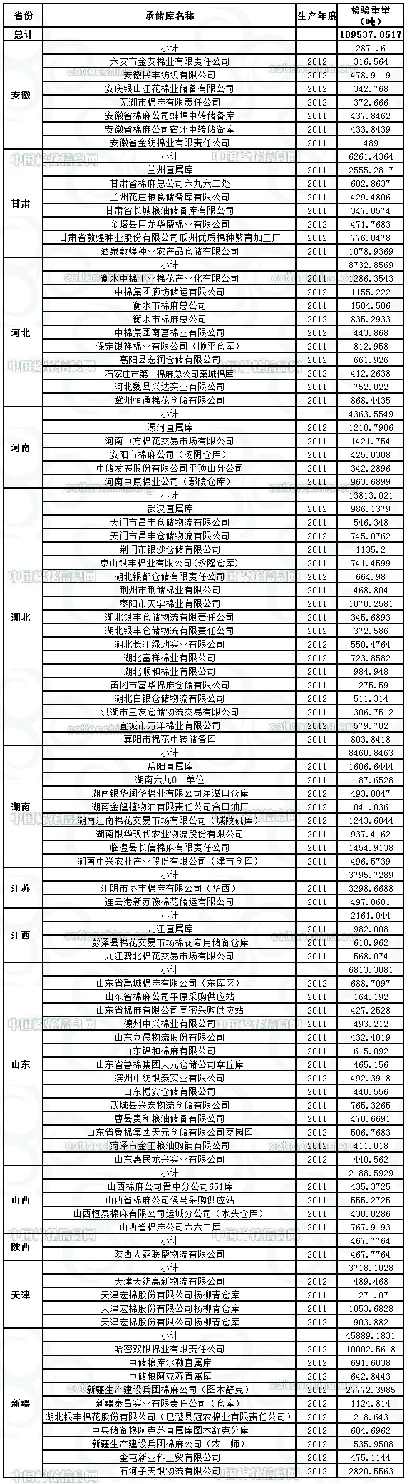 中國(guó)儲(chǔ)備棉管理總公司定于6月3日出庫(kù)銷售儲(chǔ)備109537.0517噸,其中進(jìn)口棉4352.3516噸。相關(guān)批次公檢數(shù)據(jù)見附件。具體庫(kù)點(diǎn)如下: