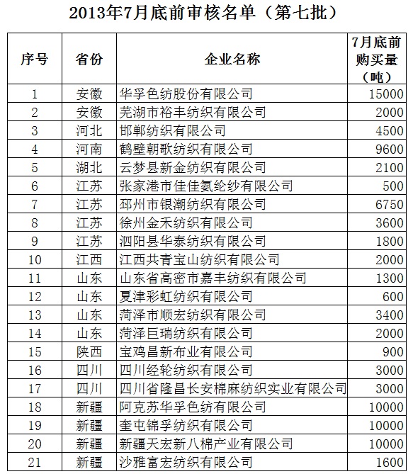 2013年儲(chǔ)備棉投放7月底前審核競(jìng)買紡織企業(yè)名單(第七批)