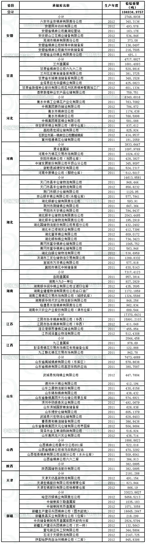 中國儲備棉管理總公司定于6月6日出庫銷售儲備104034.9757噸。其中,2011年度國產(chǎn)棉35239.9679噸,2012年度國產(chǎn)棉52803.7975噸,2011年度進(jìn)口棉15991.2103噸。相關(guān)批次公檢數(shù)據(jù)見附件。具體庫點(diǎn)如下: