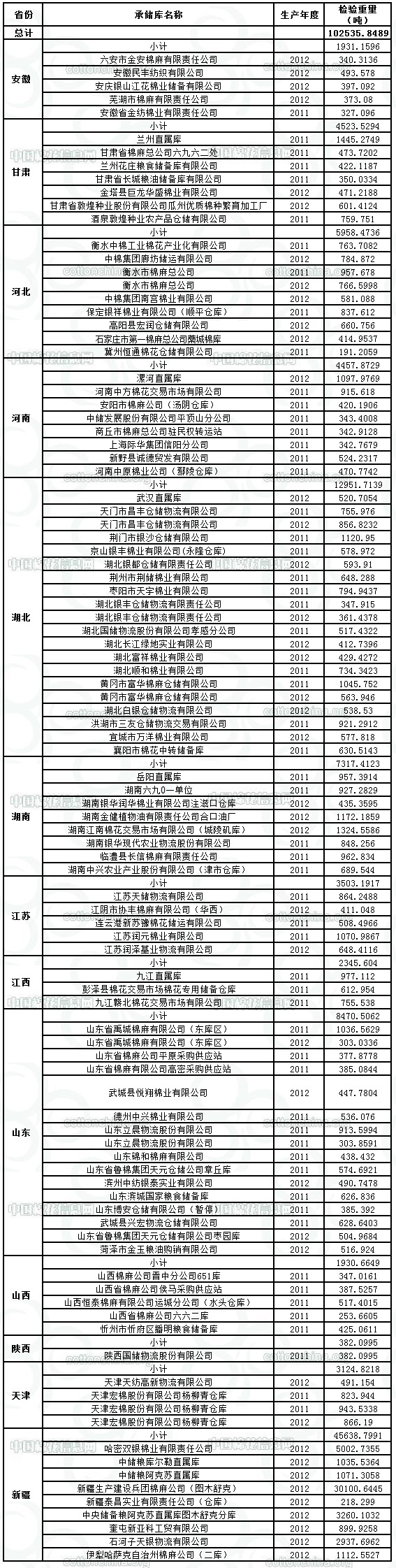 中國(guó)儲(chǔ)備棉管理總公司定于6月8日出庫(kù)銷售儲(chǔ)備102535.8489噸。其中,2011年度國(guó)產(chǎn)棉32617.4780噸,2012年度國(guó)產(chǎn)棉65089.4393噸,2011年度進(jìn)口棉4828.9316噸。相關(guān)批次公檢數(shù)據(jù)見(jiàn)附件。具體庫(kù)點(diǎn)如下: