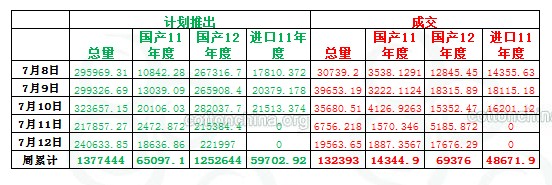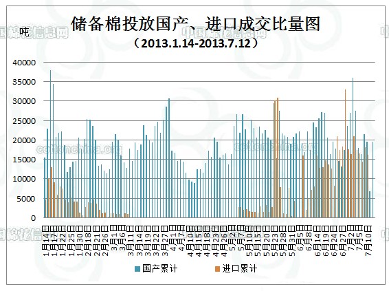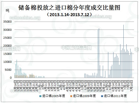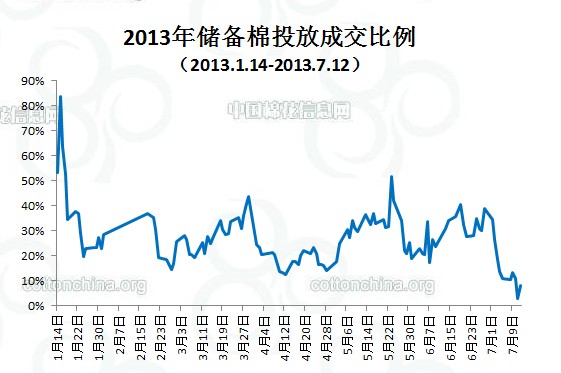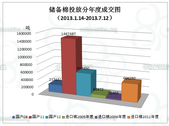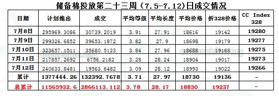 當(dāng)周(7.8-7.12)累計(jì)投放儲(chǔ)備棉1377444.262噸,實(shí)際成交132392.7678噸,成交比例9.61%;當(dāng)周成交儲(chǔ)備棉平均等級(jí)為3.71,平均長(zhǎng)度27.97,加權(quán)成交價(jià)18730元/噸,折328級(jí)成交價(jià)19135元/噸(公重)。截止上周,2013年以來(lái)累計(jì)上市投放儲(chǔ)備棉11565932.59噸,累計(jì)成交總量2866113.112噸,成交比例24.78%。