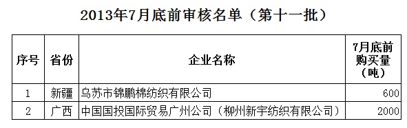 2013年儲(chǔ)備棉投放7月底前審核競(jìng)買紡織企業(yè)名單(第十一批)