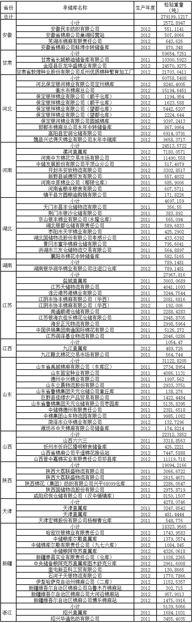 中國儲備棉管理總公司定于7月17日出庫銷售儲備279199.1217噸。其中,2011年度國產(chǎn)棉32471.641噸,2012年度國產(chǎn)棉192436.8778噸,2011年度進口棉54290.6029噸。具體庫點如下: