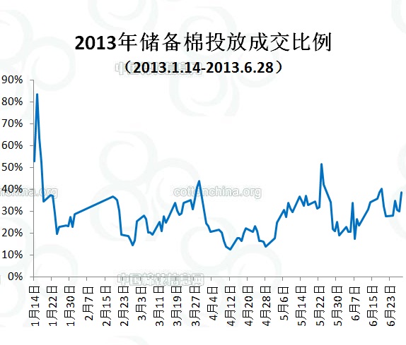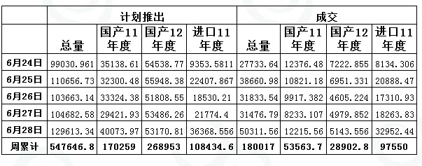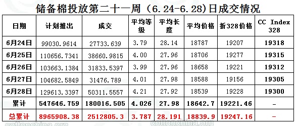 上周(6.24-6.28)累計(jì)投放儲(chǔ)備棉547646.7585噸,實(shí)際成交180016.5049噸,成交比例32.87%;當(dāng)周成交儲(chǔ)備棉平均等級(jí)為4.03,平均長度27.98,加權(quán)成交價(jià)18643元/噸,折328級(jí)成交價(jià)19221元/噸(公重)。截止上周,2013年以來累計(jì)上市投放儲(chǔ)備棉8965908.3808噸,累計(jì)成交總量2512805.3045噸,成交比例28.03%。