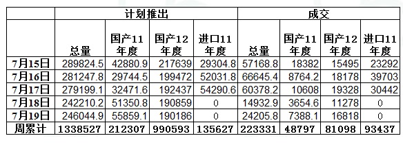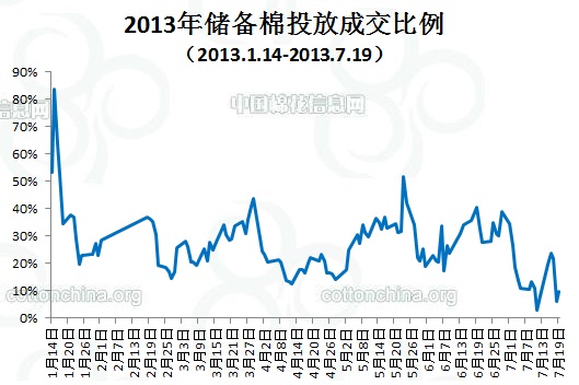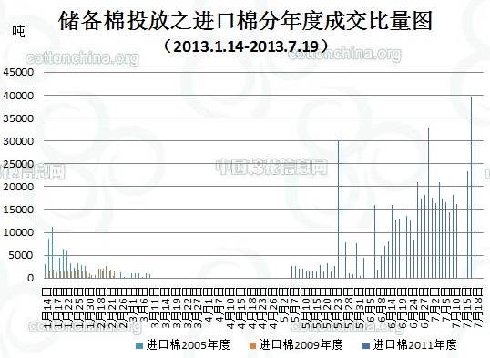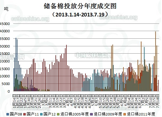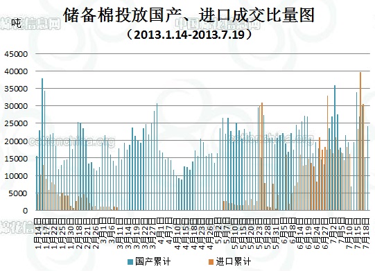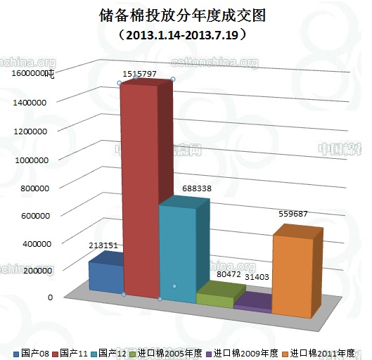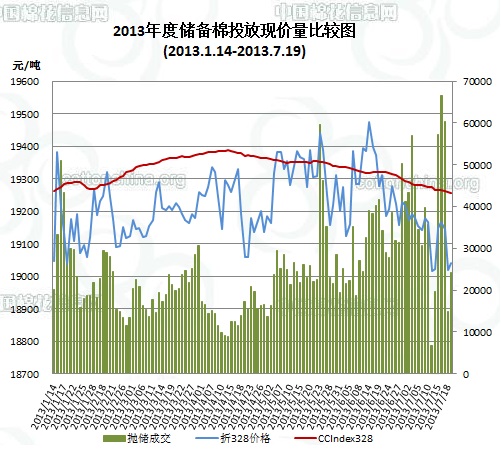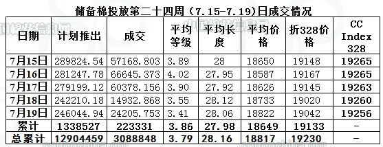 當(dāng)周(7.15-7.19)累計(jì)投放儲(chǔ)備棉1338526.554噸,實(shí)際成交223330.9528噸,成交比例16.68%;當(dāng)周成交儲(chǔ)備棉平均等級(jí)為3.86,平均長度27.98,加權(quán)成交價(jià)18649元/噸,折328級(jí)成交價(jià)19133元/噸(公重)。截止上周,2013年以來累計(jì)上市投放儲(chǔ)備棉12904459.14噸,累計(jì)成交總量3088848.23噸,成交比例23.94%。