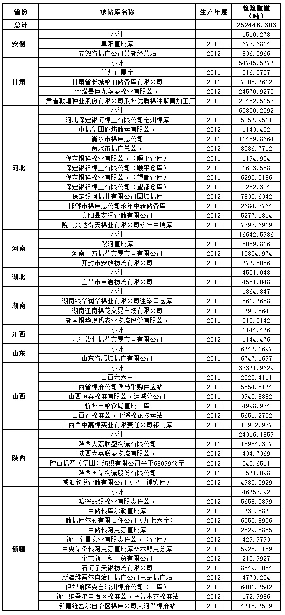 中國儲備棉管理總公司定于7月26日出庫銷售儲備252448.303噸。其中,2011年度國產(chǎn)棉58444.8621噸,2012年度國產(chǎn)棉194003.4409噸。具體庫點如下: