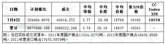 7月4日儲(chǔ)備棉投放數(shù)量為324489.9076噸,實(shí)際成交44914.272噸,成交比例13.84%,較上一交易日下降4.81%,其中2011年度國(guó)產(chǎn)棉花成交11014.8272噸,2012年度國(guó)產(chǎn)棉花成交16428.8569噸,2011年度進(jìn)口棉17470.5879噸。當(dāng)日成交儲(chǔ)備棉平均等級(jí)為3.77,較上一交易日降0.21;平均長(zhǎng)度28.08,較上一交易日降0.13;加權(quán)成交價(jià)18759元/噸,較上一交易日降152元/噸;折328級(jí)成交價(jià)19180元/噸(公重),較前一交易日降10元/噸,比當(dāng)日CCIndex328價(jià)格低99元/噸。截止7月4日,累計(jì)上市總量9877486.198噸,累計(jì)成交總量2699222.246噸,總成交比例27.33%。其中進(jìn)口棉累計(jì)成交512868.8213噸,5月6號(hào)至今累計(jì)成交2011年度進(jìn)口棉400993.6087噸。