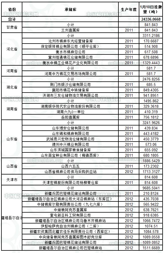 定于1月10日出庫銷售儲備棉24336.0668噸。其中2011年度國產(chǎn)棉12937.25噸,2012年度國產(chǎn)棉11398.8169噸。相關(guān)批次公檢數(shù)據(jù)見附件。具體庫點如下: