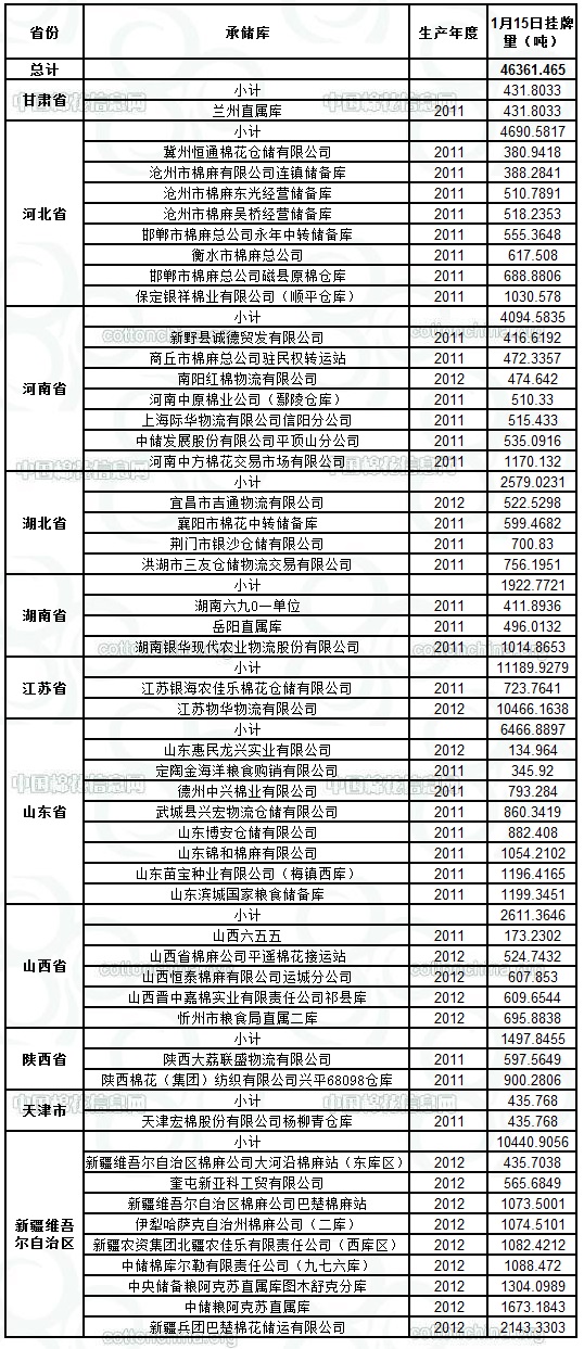定于1月15日出庫(kù)銷售儲(chǔ)備棉46361.465噸。其中2011年度國(guó)產(chǎn)棉21884.1254噸,2012年度國(guó)產(chǎn)棉(新標(biāo)準(zhǔn))24477.3396噸。今日無(wú)進(jìn)口棉。相關(guān)批次公檢數(shù)據(jù)見附件。具體庫(kù)點(diǎn)如下: