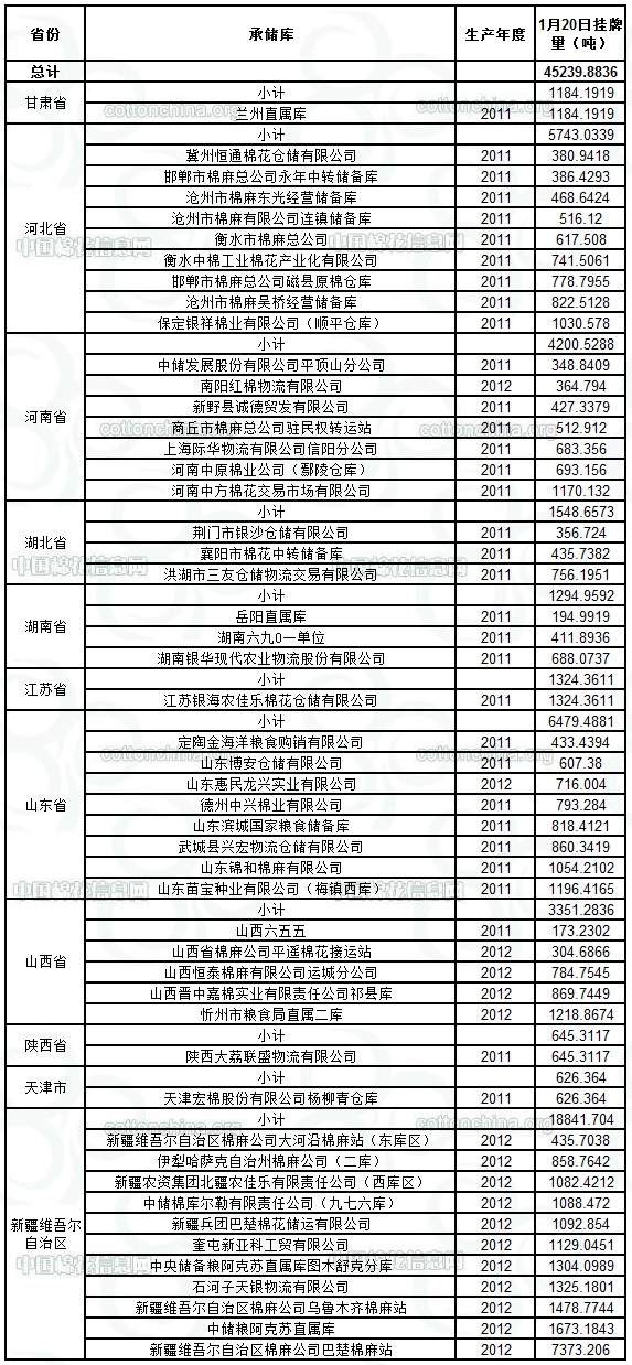 各紡織企業(yè): 定于1月20日出庫(kù)銷售儲(chǔ)備棉45239.8836噸。其中2011年度國(guó)產(chǎn)棉22139.3282噸,2012年度國(guó)產(chǎn)棉(新標(biāo)準(zhǔn))23100.5554噸。今日無(wú)進(jìn)口棉。相關(guān)批次公檢數(shù)據(jù)見(jiàn)附件。具體庫(kù)點(diǎn)如下: