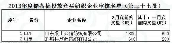 2013年度儲(chǔ)備棉投放競(jìng)買紡織企業(yè)審核名單(第三十七批)