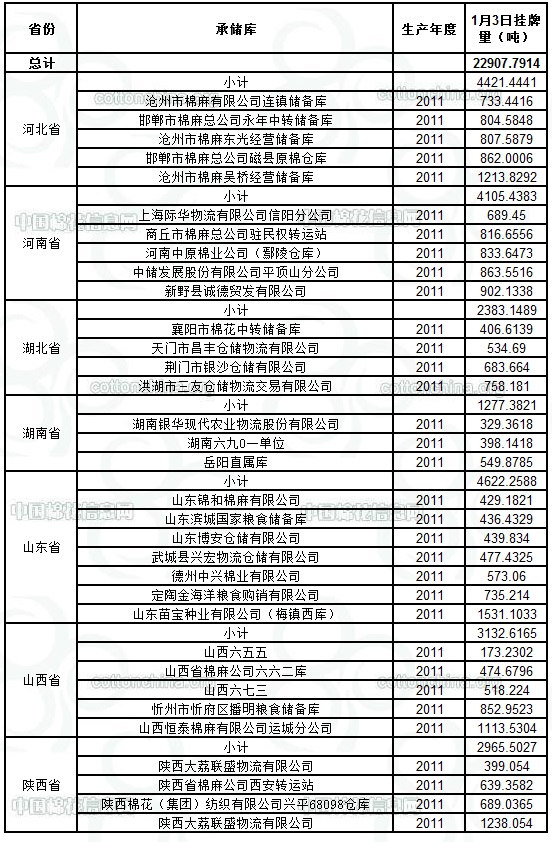 各紡織企業(yè): 定于1月3日出庫銷售儲備棉22907.7914噸。其中2011年度國產棉21376.6881噸,2011年度進口棉1531.1033噸。相關批次公檢數(shù)據(jù)見附件。具體庫點如下: