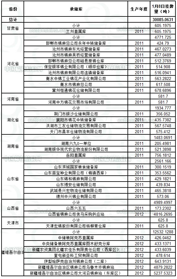 各紡織企業(yè): 定于1月8日出庫銷售儲(chǔ)備棉30085.0631噸。其中2011年度國產(chǎn)棉12736.6648噸,2012年度國產(chǎn)棉17348.3983噸。相關(guān)批次公檢數(shù)據(jù)見附件。具體庫點(diǎn)如下: