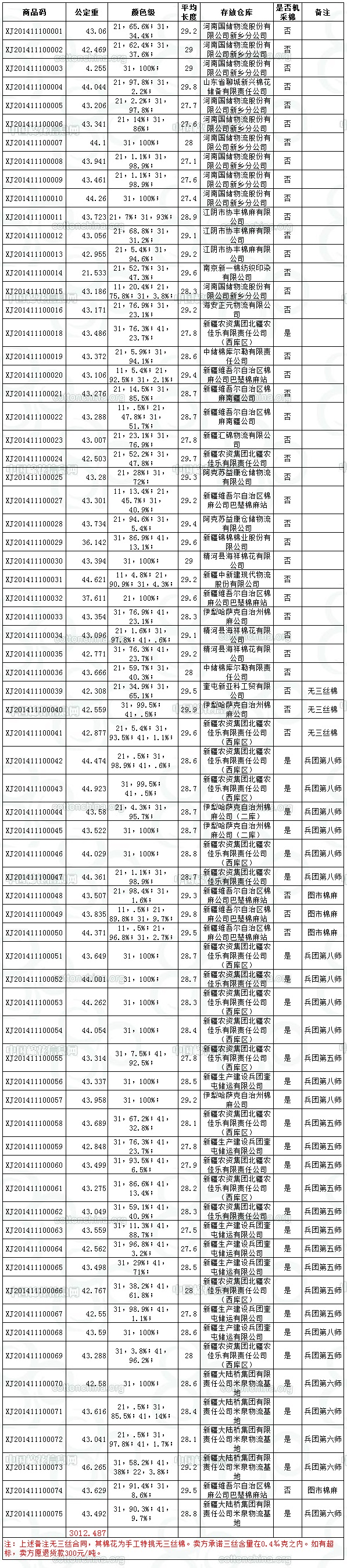 各交易商: 全國棉花交易市場定于11月10日推出新疆棉競賣資源3012.487噸,其中新疆庫區(qū)資源2378.726噸(手摘棉1026.608噸,機(jī)采棉1352.118噸),內(nèi)含兵團(tuán)棉1483.974噸;內(nèi)地庫區(qū)資源633.761噸(手摘棉633.761噸)。當(dāng)日競賣資源中有3批無三絲棉。賣方承諾每噸三絲含量在0.4‰克之內(nèi)。如有超標(biāo),賣方愿退貨款300元/噸。相關(guān)詳細(xì)數(shù)據(jù)見附件。具體庫點(diǎn)如下: