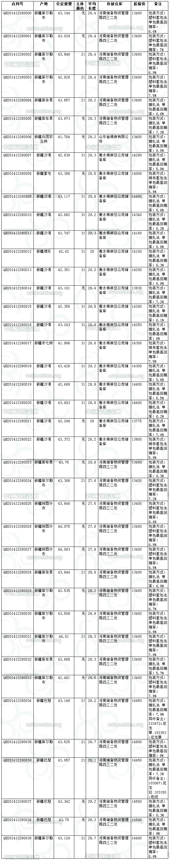 各交易商: 全國(guó)棉花交易市場(chǎng)定于12月26日推出期貨公檢棉競(jìng)賣資源1726.529噸。最低起拍價(jià)13400元/噸。相關(guān)詳細(xì)數(shù)據(jù)見附件。具體庫(kù)點(diǎn)如下: