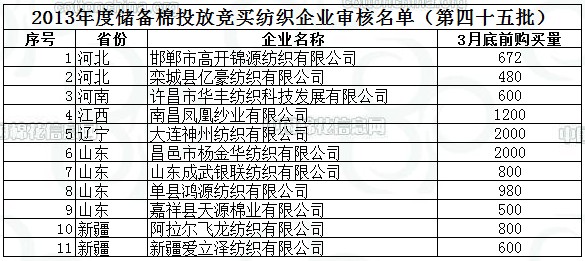 2013年度儲(chǔ)備棉投放競(jìng)買紡織企業(yè)審核名單(第四十五批)
