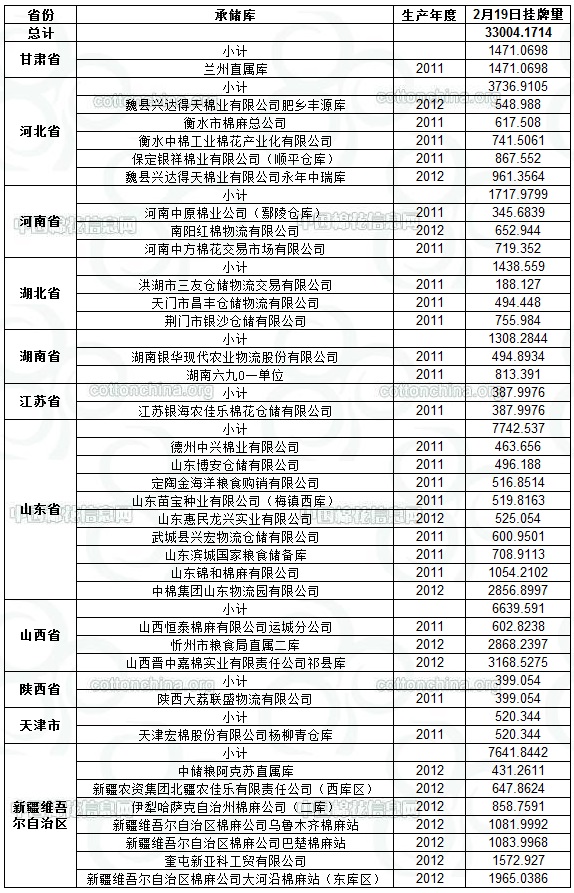 各紡織企業(yè): 定于2月19日出庫銷售儲(chǔ)備棉33004.1714噸。其中2011年度國產(chǎn)棉13780.3179噸,2012年度國產(chǎn)棉(新標(biāo)準(zhǔn))19523.8535噸。今日無進(jìn)口棉。相關(guān)批次公檢數(shù)據(jù)見附件。具體庫點(diǎn)如下: