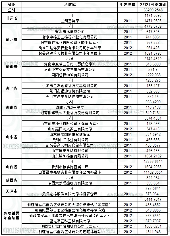 定于2月21日出庫(kù)銷售儲(chǔ)備棉33209.2548噸。其中2011年度國(guó)產(chǎn)棉10815.9049噸,2012年度國(guó)產(chǎn)棉(新標(biāo)準(zhǔn))22393.3499噸。今日無(wú)進(jìn)口棉。相關(guān)批次公檢數(shù)據(jù)見(jiàn)附件。具體庫(kù)點(diǎn)如下: