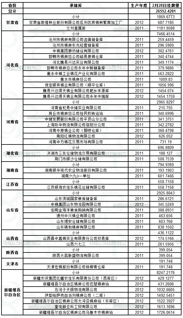 各紡織企業(yè): 定于2月28日出庫銷售儲(chǔ)備棉26552.4281噸。其中2011年度國產(chǎn)棉13260.6725噸,2012年度國產(chǎn)棉(新標(biāo)準(zhǔn))13291.7556噸。今日無進(jìn)口棉。相關(guān)批次公檢數(shù)據(jù)見附件。具體庫點(diǎn)如下: