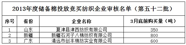 2013年度儲備棉投放競買紡織企業(yè)審核名單(第五十二批)