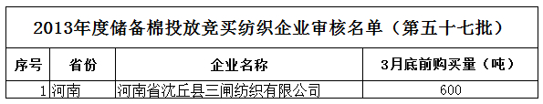 2013年度儲(chǔ)備棉投放競(jìng)買(mǎi)紡織企業(yè)審核名單(第五十七批)