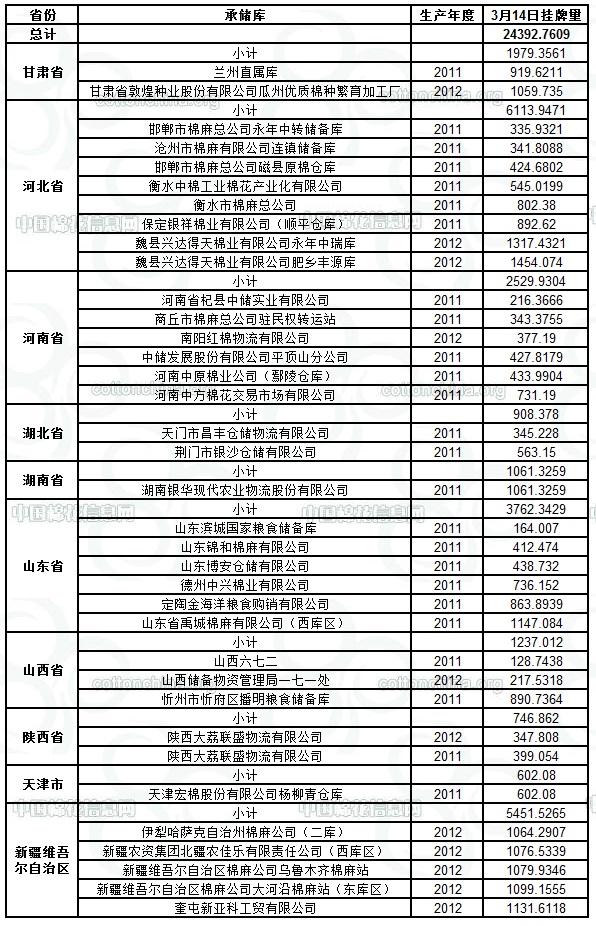 各紡織企業(yè): 定于3月14日出庫銷售儲(chǔ)備棉24392.7609噸。其中2011年度國產(chǎn)棉14167.4635噸,2012年度國產(chǎn)棉(新標(biāo)準(zhǔn))10225.2974噸。今日無進(jìn)口棉。相關(guān)批次公檢數(shù)據(jù)見附件。具體庫點(diǎn)如下: