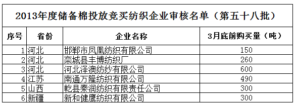 2013年度儲備棉投放競買紡織企業(yè)審核名單(第五十八批)