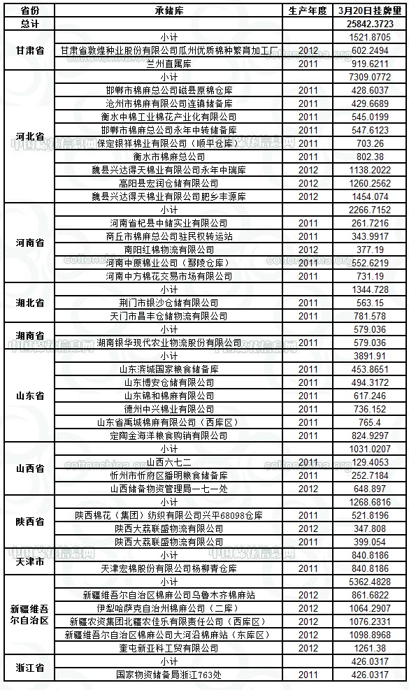 定于3月20日出庫銷售儲備棉25842.3723噸。其中2011年度國產(chǎn)棉14225.181噸,2012年度國產(chǎn)棉(新標(biāo)準(zhǔn))11617.1913噸。今日無進口棉。相關(guān)批次公檢數(shù)據(jù)見附件。具體庫點如下: