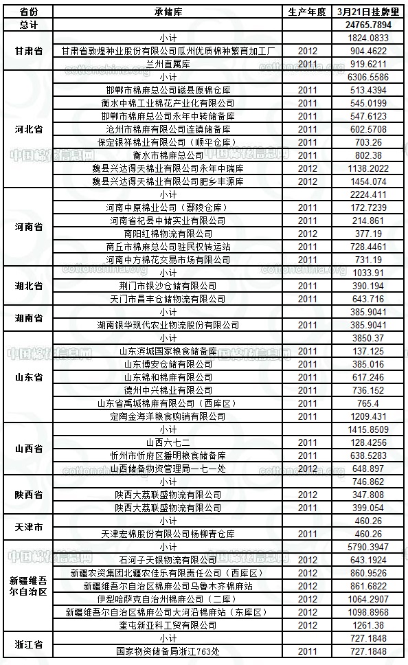 各紡織企業(yè): 定于3月21日出庫銷售儲(chǔ)備棉24765.7894噸。其中2011年度國產(chǎn)棉13462.1581噸,2012年度國產(chǎn)棉(新標(biāo)準(zhǔn))11303.6313噸。今日無進(jìn)口棉。相關(guān)批次公檢數(shù)據(jù)見附件。具體庫點(diǎn)如下: