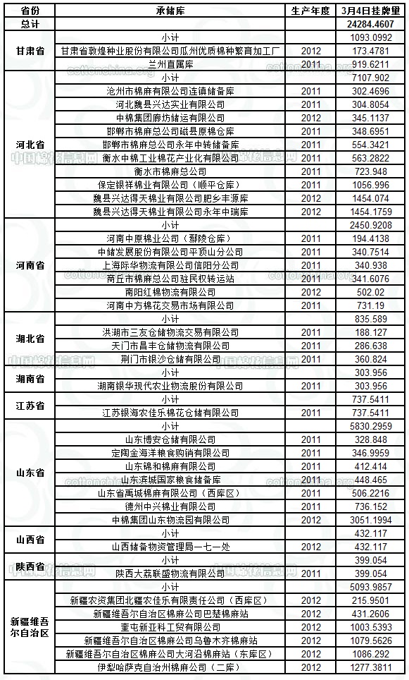 定于3月4日出庫(kù)銷售儲(chǔ)備棉24284.4607噸。其中2011年度國(guó)產(chǎn)棉11778.2969噸,2012年度國(guó)產(chǎn)棉(新標(biāo)準(zhǔn))12506.1638噸。今日無(wú)進(jìn)口棉。相關(guān)批次公檢數(shù)據(jù)見(jiàn)附件。具體庫(kù)點(diǎn)如下: