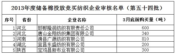 2013年度儲備棉投放競買紡織企業(yè)審核名單(第五十四批)
