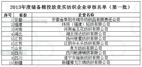 2013年度儲備棉投放競買紡織企業(yè)審核名單新(第一批)